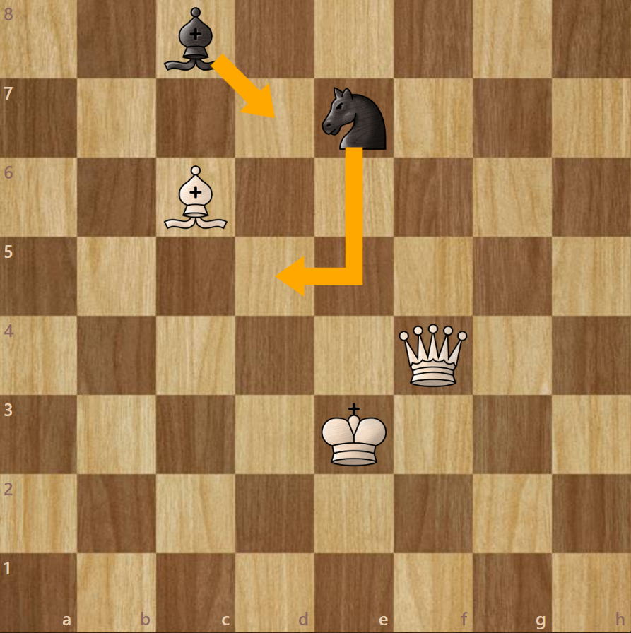 다음 이미지에서 흑은 나이트를 d5에 배치해서 상대 킹과 퀸에 대해 포크를 걸 수 있다. 하지만 정작 중요한 d5를 백의 비숍이 막고 있다. 즉, 흑의 입장에서는 저 비숍만 갖다 치워버리면 만사형통이다. 흑은 비숍을 d7에 배치하여 백의 비숍이 c6를 포기하도록 유지한다. 흑의 비숍은 잡힐 수도 있지만, 이는 나중에 퀸을 따내기 위한 작은 희생(Sacrifice)이다.